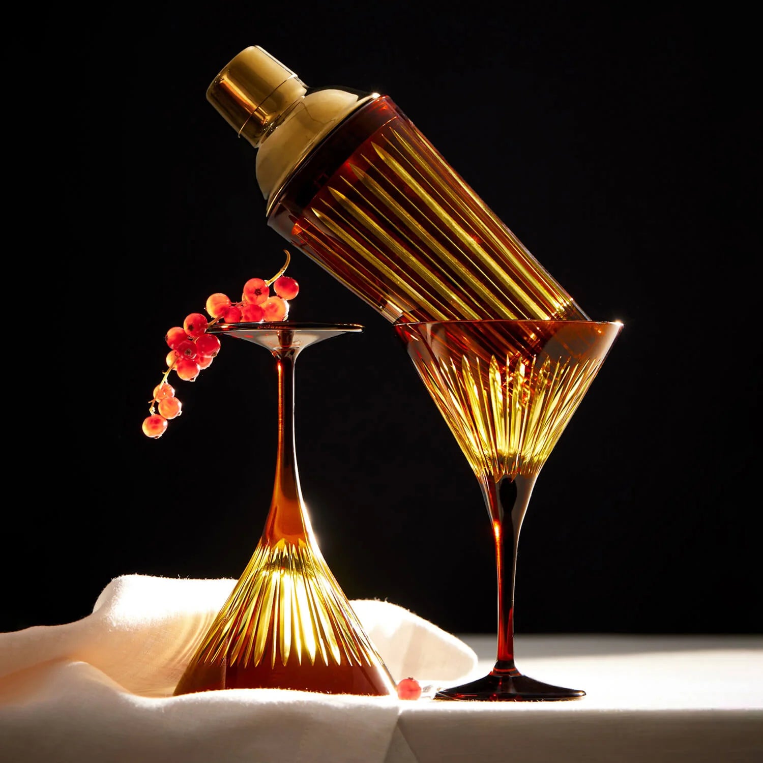 The art of the bar becomes a celebration of color and form. Jewel-toned glass, cut by hand and sculpted into bold silhouettes, transforms every pour into a gesture of elegance. From flutes to shakers, decanters to ice buckets, each piece is designed for those who entertain with intention.