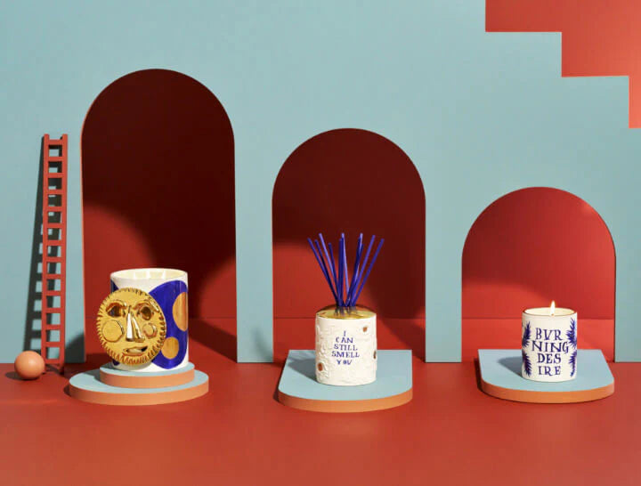 L'OBJET features its iconic veti-vert scent in the Ruan Hoffman collection. The BURNING DESIRE candle wraps the fragrance in a striking royal blue ribbon design with gold and platinum details. With its playful lid and intricate craftsmanship, the large MASK candle adds fun and elegance. The I CAN STILL SMELL YOU oil diffuser dazzles with it's gold-outlined smoky eye design.